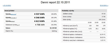 Zásadní informací v denním reportu je výroba elektroměru (zobrazuje se i veStavu elektrárny), případně analyzátory sítě. Díky možnosti PSC vidíte reálné rozdíly mezi vyrobenou el. energie na elektroměru, analyzátorech, střídačích a osvitovém čidle.